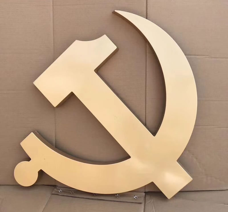 中國共產黨黨徽為鐮刀和錘頭組成的圖案,圖案為金黃色。錘子、鐮刀代表工人和農民的勞動工具,象征著中國共產黨是中國工人階級的先鋒隊,代表著工人階級和廣大人民群眾的根本利益。黃色象征光明。